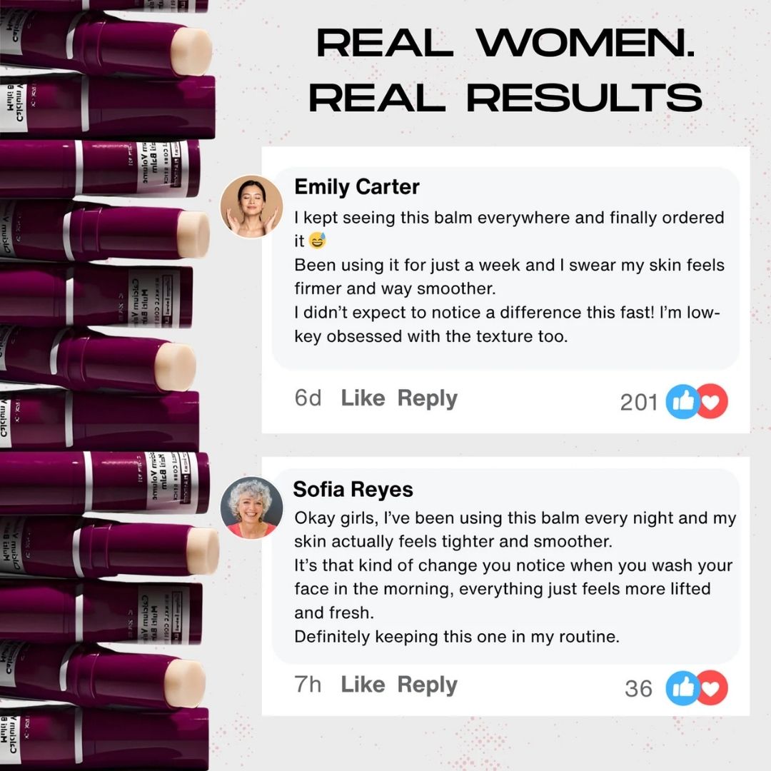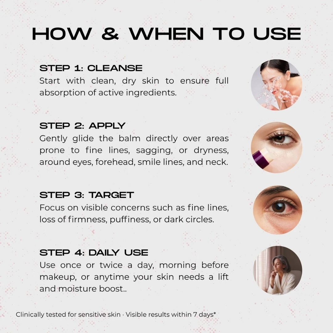 Glide the balm gently over areas where volume and elasticity have faded — under eyes, around lips, forehead, and neck.